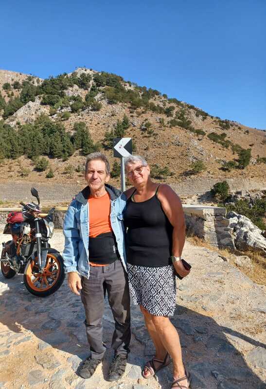 Gestartet sind wir in Kavros Richtung Vrises, wo wir dann abbogen dem Wegweiser nach Chora Sfakion folgend dem Süden der Insel entgegen. Ab und zu musste ein kleiner Halt sein, um die Beine zu vertreten oder einfach die Aussicht zu geniessen. Bei einem Halt oberhalb Chora Sfakion trafen wir zwei junge Motorradfahrer. Es ist immer wieder interessant, wie schnell man mit ein wenig Sprachkenntnis in Kontakt kommt.
