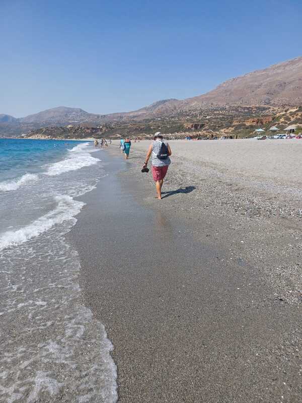 Endlich war es so weit, die letzten Kurven und Triopetra, mein liebster Strand auf Kreta lag vor uns. Zuerst lenkten wir unsere Schritte zur Taverne Apothiki am Triopetra Paralia, da unter den Bäumen genossen wir ein paar leckere Vorspeisen, alle auf den Tisch gestellt und jede von uns versuchte, was ihr schmeckte.